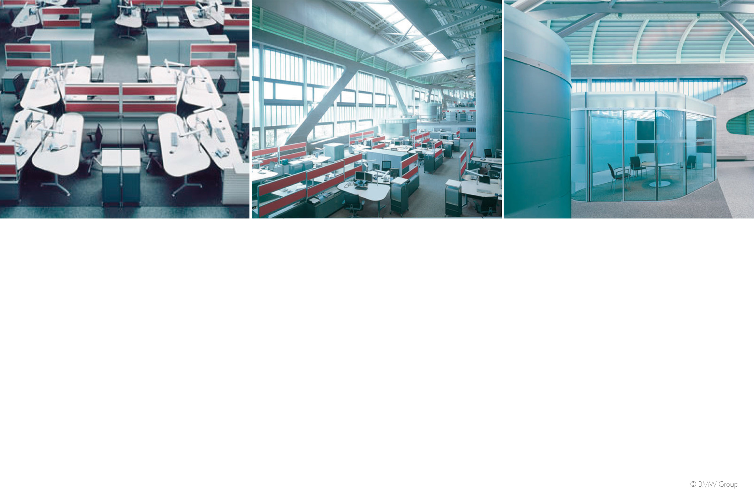 Im Ausschreibungsverfahren wurde ein Bürokonzept gemeinsam mit Büromöbelhersteller Bene für 650 Arbeitsplätze im Open-Space-Büro geschaffen. Der Arbeitsplatz des Chefs steht mitten im Raum, die Mitarbeiter arbeiten alle an gleichen Schreibtischen und ziehen sich zur konzentrierten Arbeit und zu längeren Besprechungen in transparente Think Tanks zurück. Der Blick in die Produktionsabläufe hält dabei das Management unmittelbar auf aktuellem Stand.