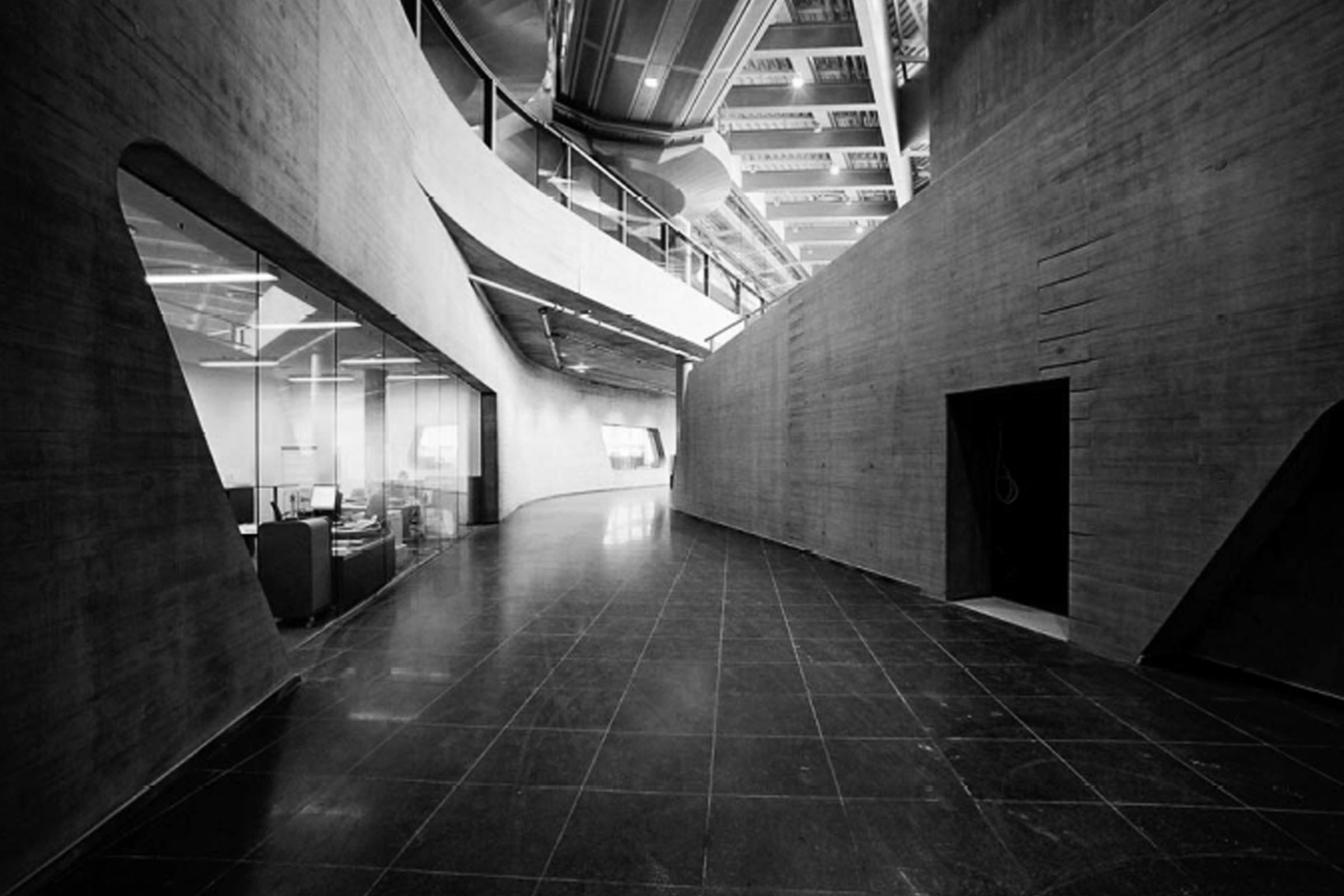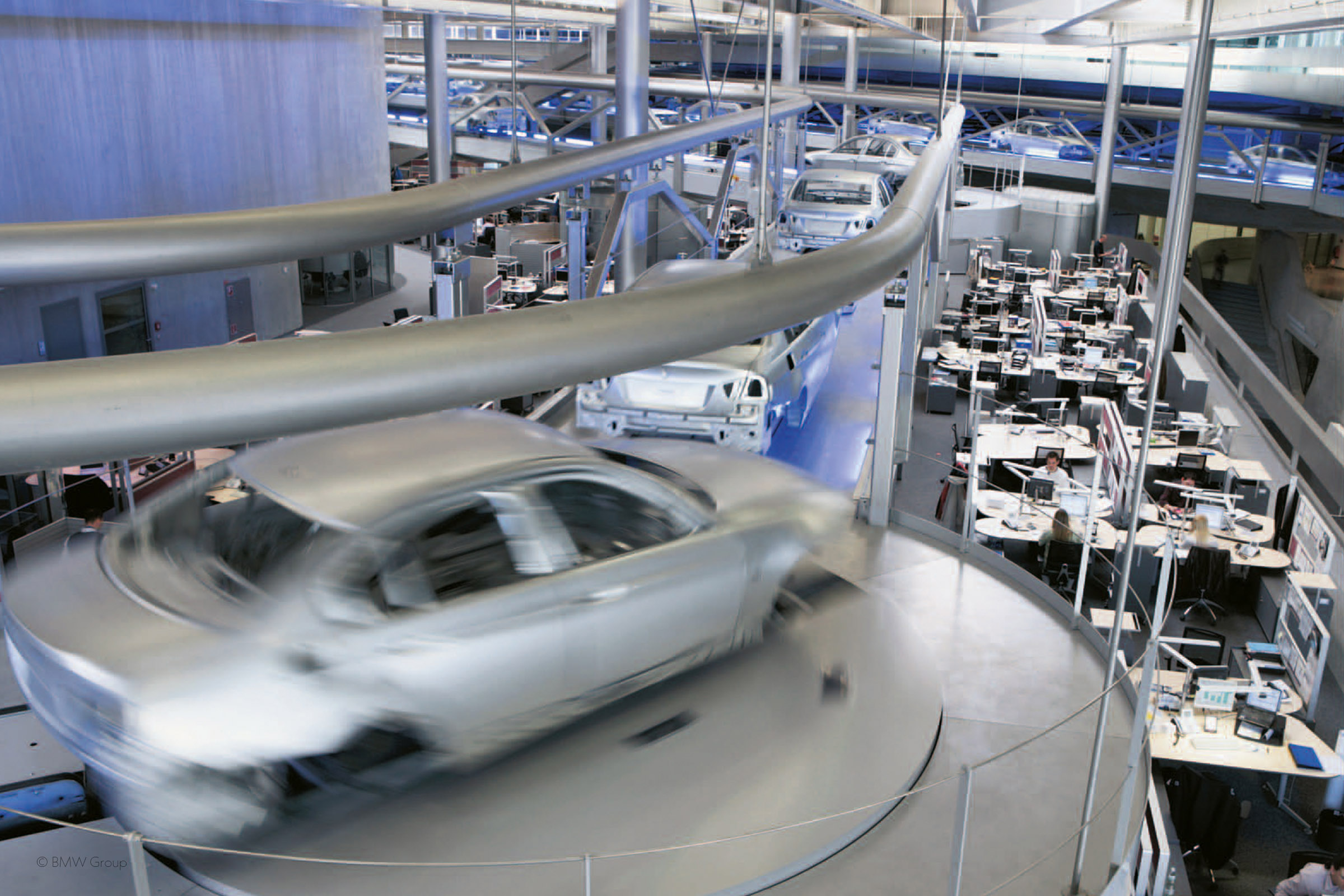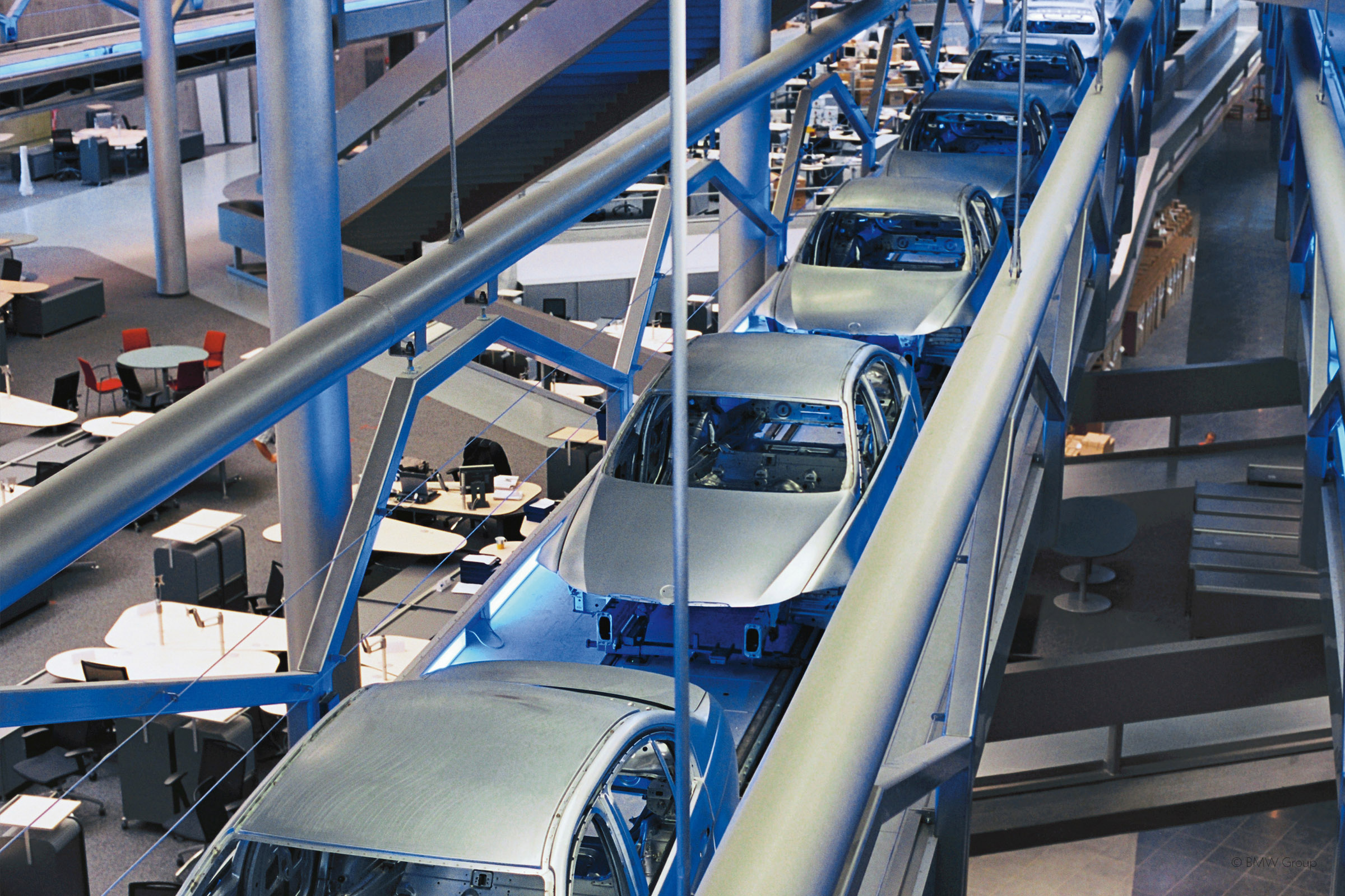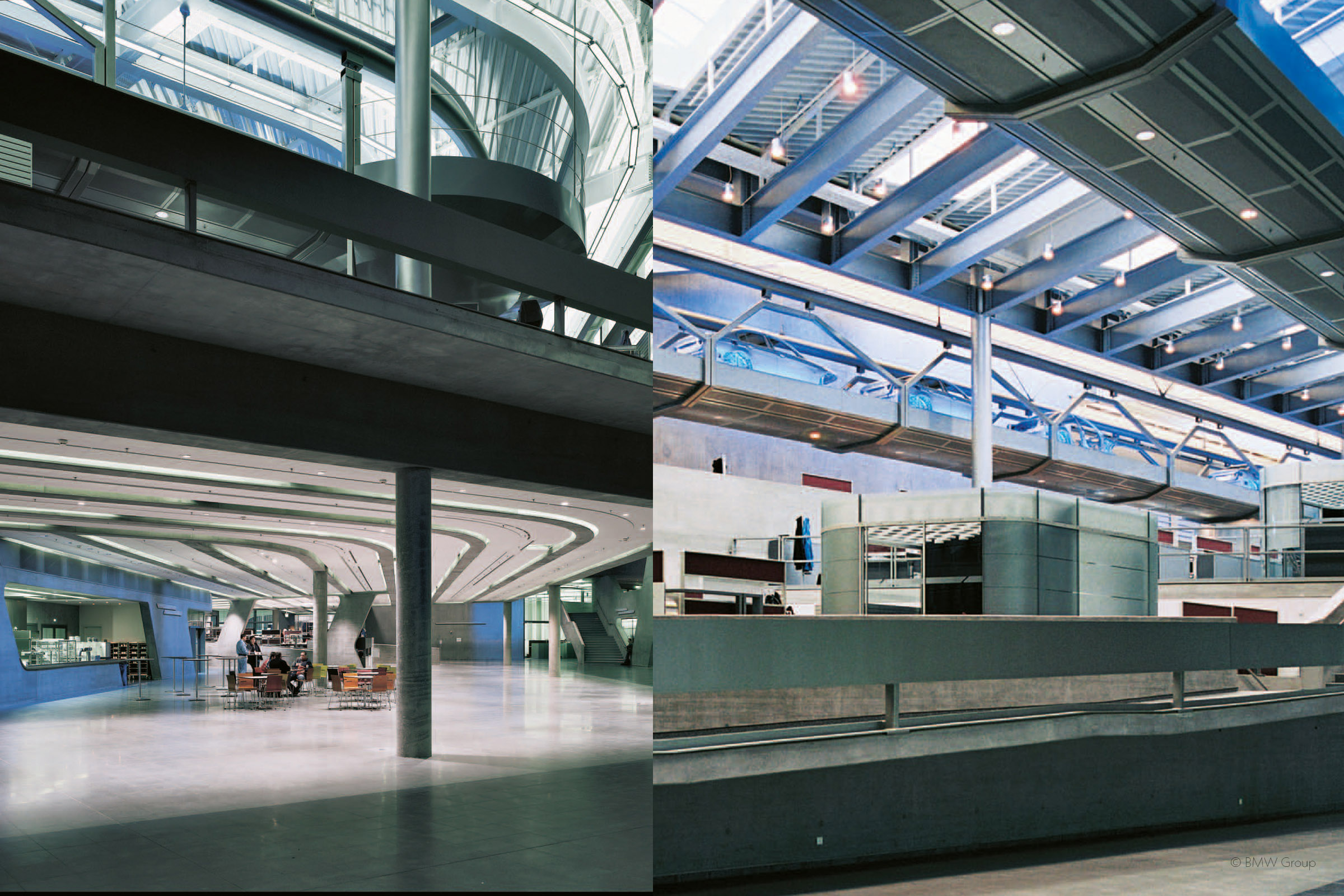 Das durch Zaha Hadid Architekten entworfene Zentralgebäude ist das kommunikative Zentrum des Werkes. Hier laufen die wesentlichen Kommunikationsbeziehungen zusammen. Im Leipziger Werk nimmt das Management unmittelbar am Produktionsprozess teil. Über den Köpfen der Büromitarbeiter bewegen sich auf Transportbändern die Automobile in allen Stadien ihrer Fertigung - vom Karosseriebau in die Lackiererei, von der Lackiererei in die Montage. Ein steter Fluss von Fahrzeugteilen bahnt sich, von neonblauen Leuchten angestrahlt, fast lautlos seinen Weg durch die Büros.