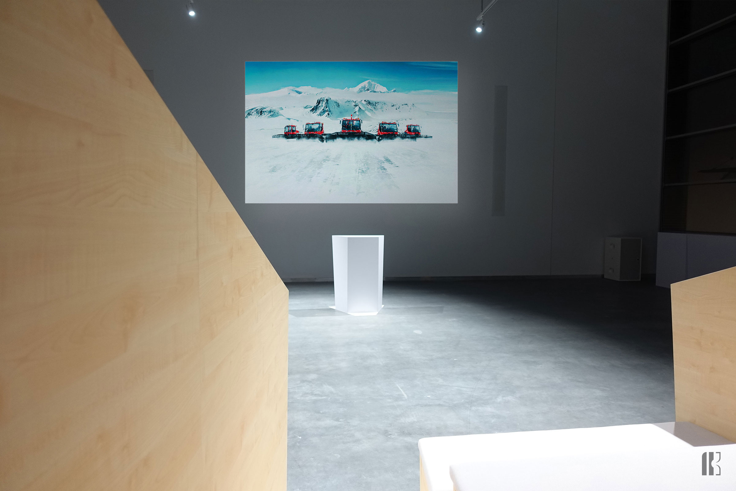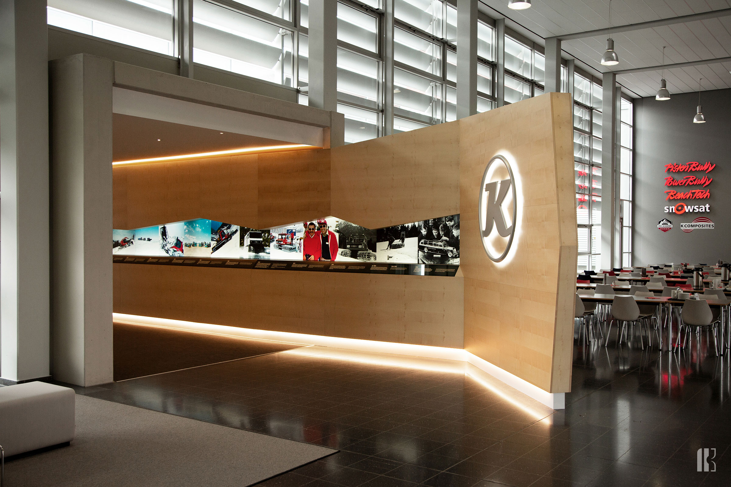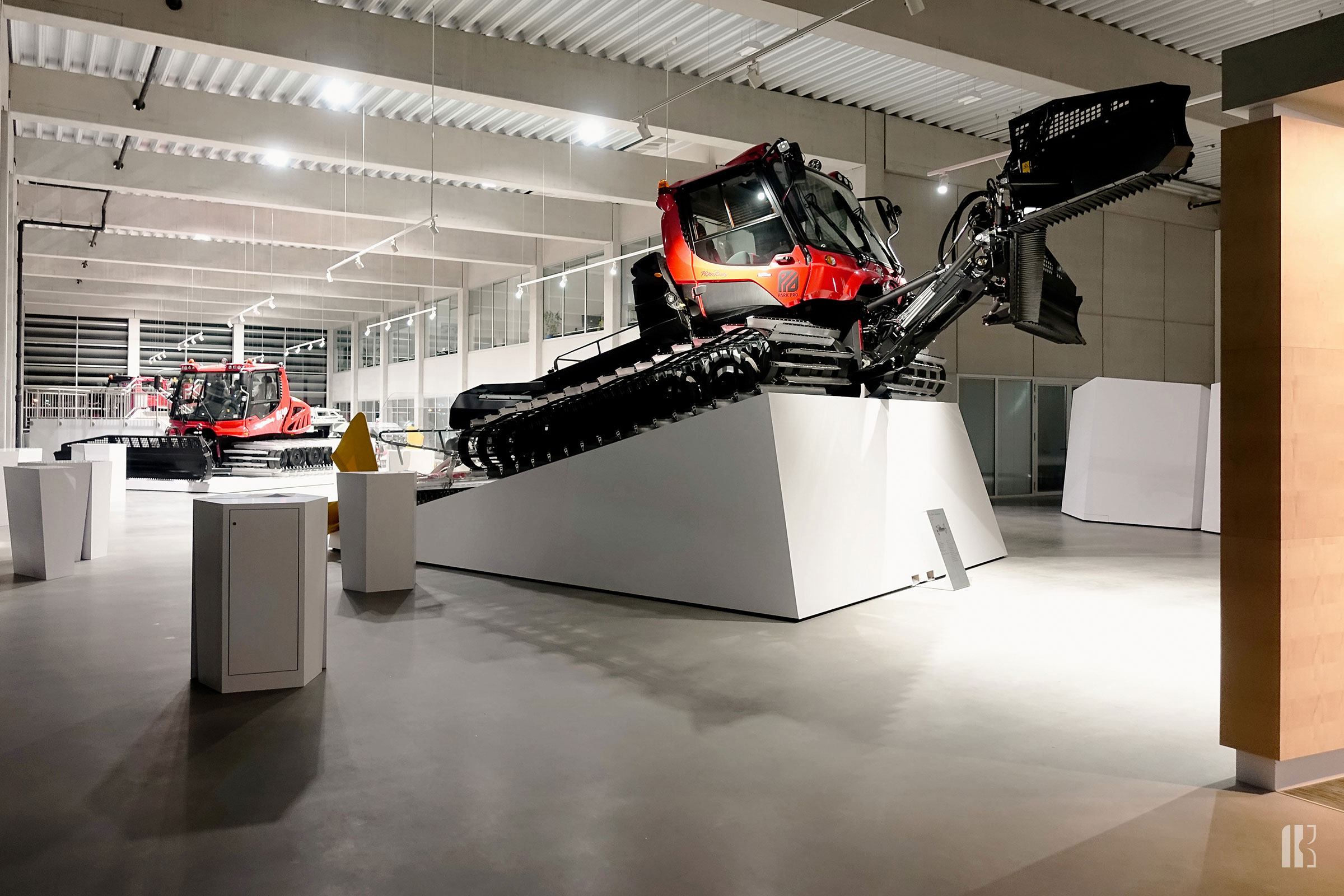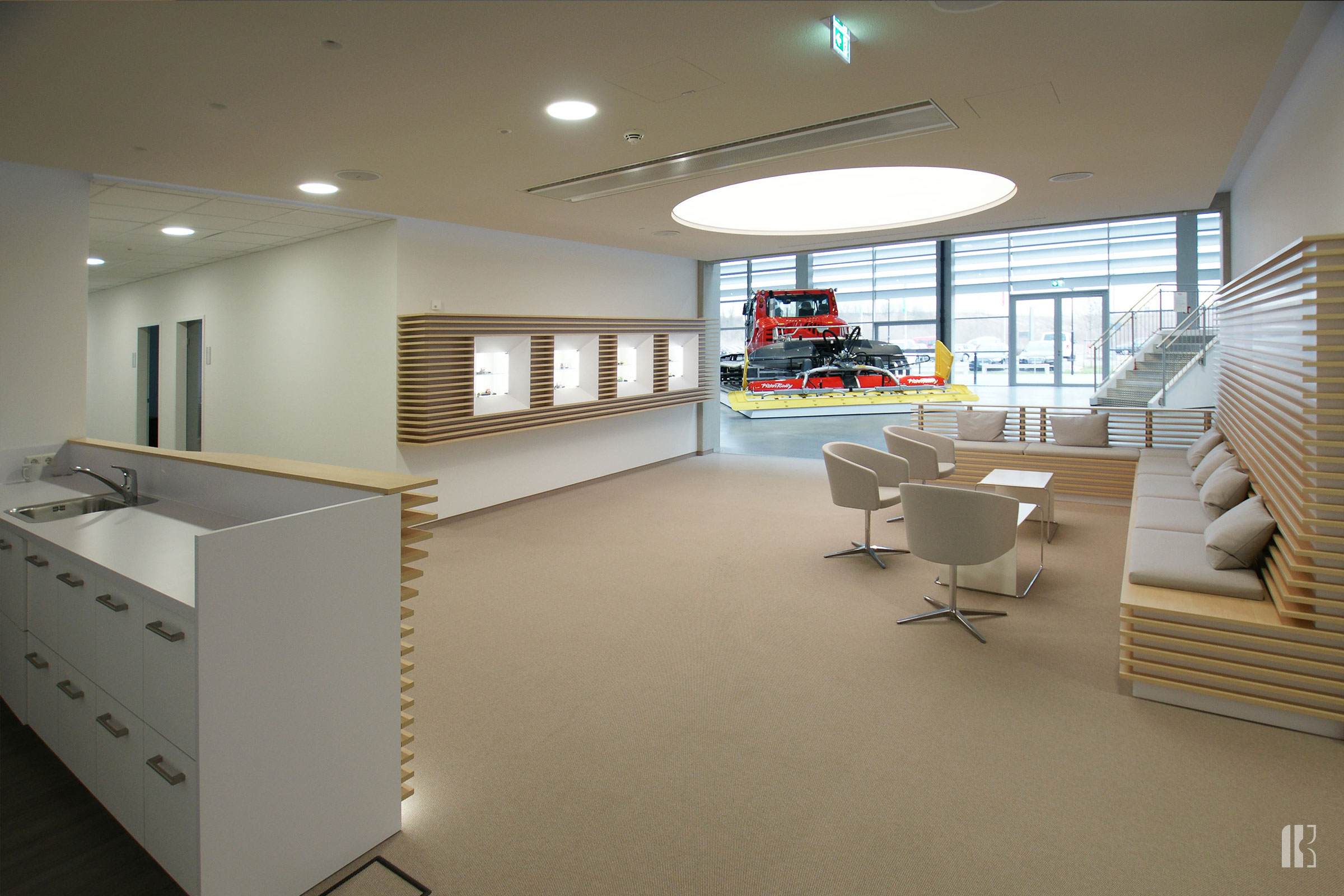 Die Kässbohrer Geländefahrzeug AG in Laupheim stellt Fahrzeuge für extreme Einsätze am Berg und im Tal, am Strand sowie im Gelände her. Für den Hauptsitz in Laupheim entstand 2016 für die Präsentation von Pistenfahrzeugen, Standreinigern und Oldtimern ein Kundencenter mit Büroräumen. Für das multifunktionale Gebäude, ausgestattet mit modernster Medientechnik, das auch Platz für die neusten Modelle und für Veranstaltungen mit bis zu 500 Gästen bietet, wurde die Innenarchitektur mit Ausstellungs-, Kommunikations- und Büroräumen gestaltet. Die Atmosphäre spielt mit Kälte des Winters und der warmen Behaglichkeit eines modernen, alpinen Interieurs. Das Konzept, das für den Messestand von Pistenbully entwickelt wurde, ist auch im neu gestalteten Showroom in Laupheim sichtbar: die Strahlkraft der Marke wurde in eine einheitliche Corporate Architecture übertragen.
