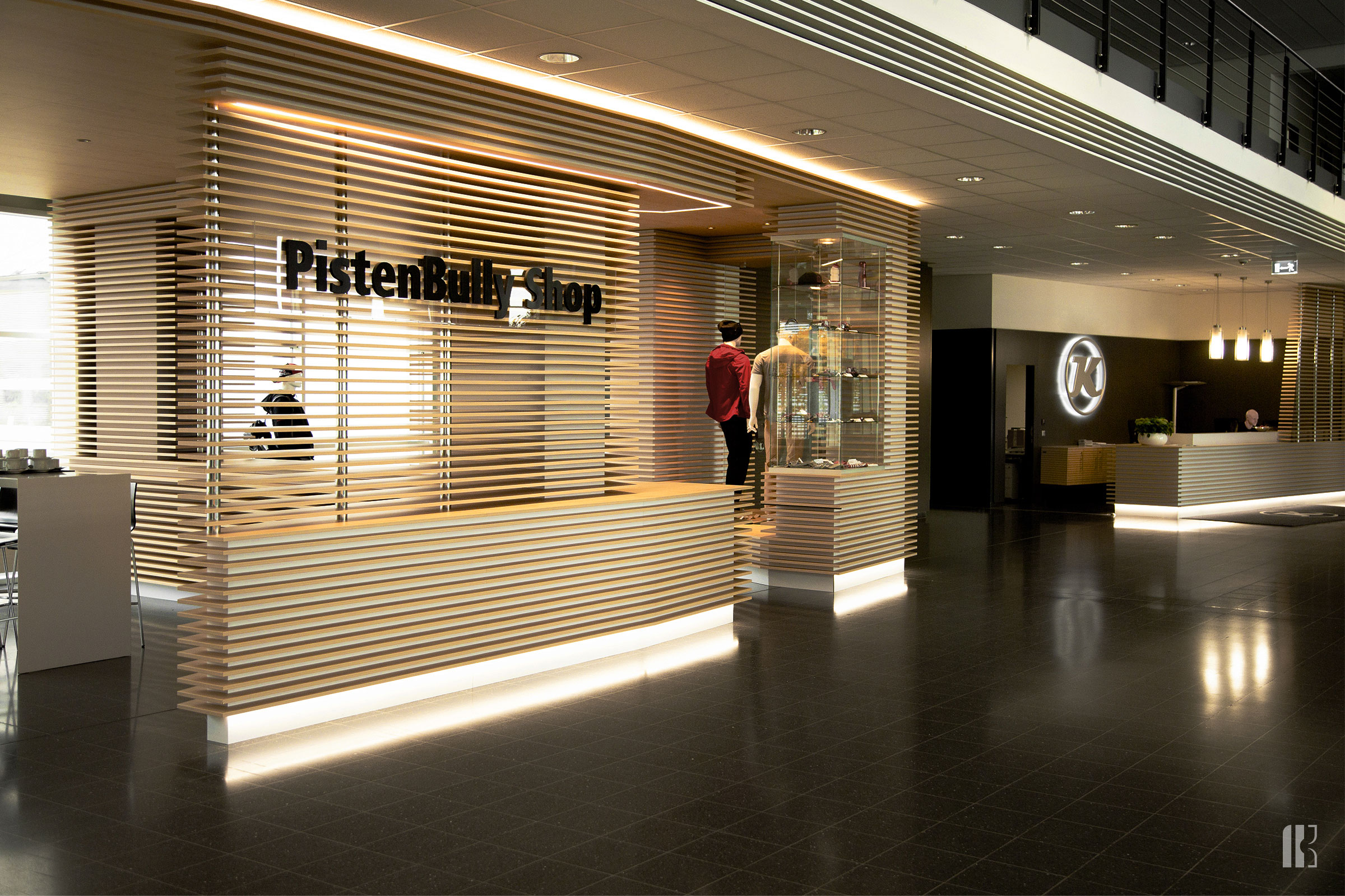 Mobile Tribünen im Berg-Stil schaffen Platz für 70 Kunden oder Mitarbeiter und sind für Präsentation von Multimedia Veranstaltung flexibel nutzbar. Ein Raumelement mit Bergsilhouette verbindet das Hauptgebäude mit dem neuen Kundencenter über einen Gang, in dem Meilensteine die Firmengeschichte in Wort und Bild darstellen. Eine Kommunikation-Lounge mit Küche schafft die Verbindung zwischen Büroräumen und Ausstellungsbereich. Der PistenBully Shop ist auf Basis der Messestand-Konzeption auch im Foyer des Unternehmens innenarchitektonisch integriert. Gemeinsame Konzeption mit Innenarchitektur Angelika Gierer, Garmisch-Partenkirchen. Realisierung durch Nething Generalplaner GmbH Architekten & Planer und fey Messe & Objektdesign, Ulm.