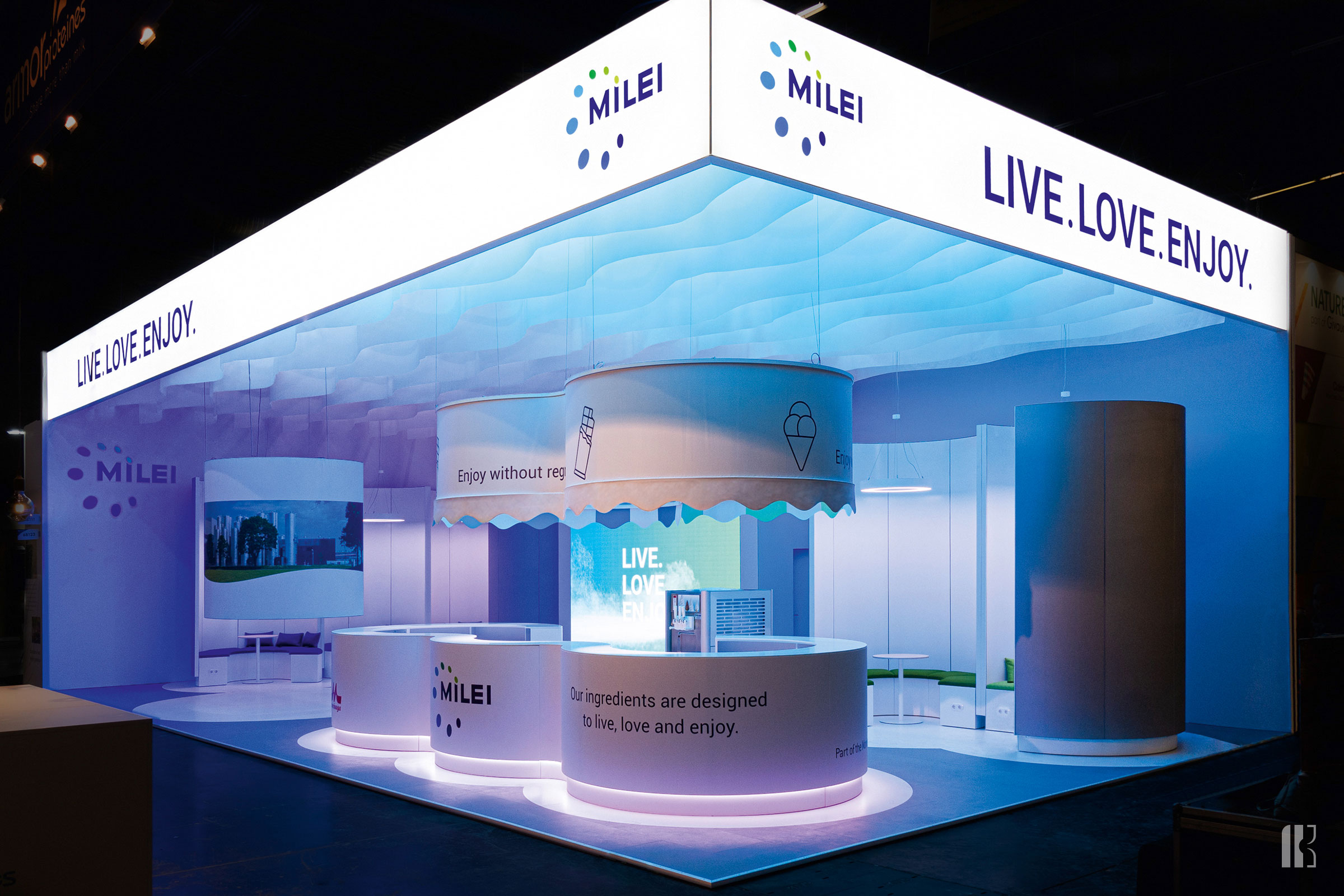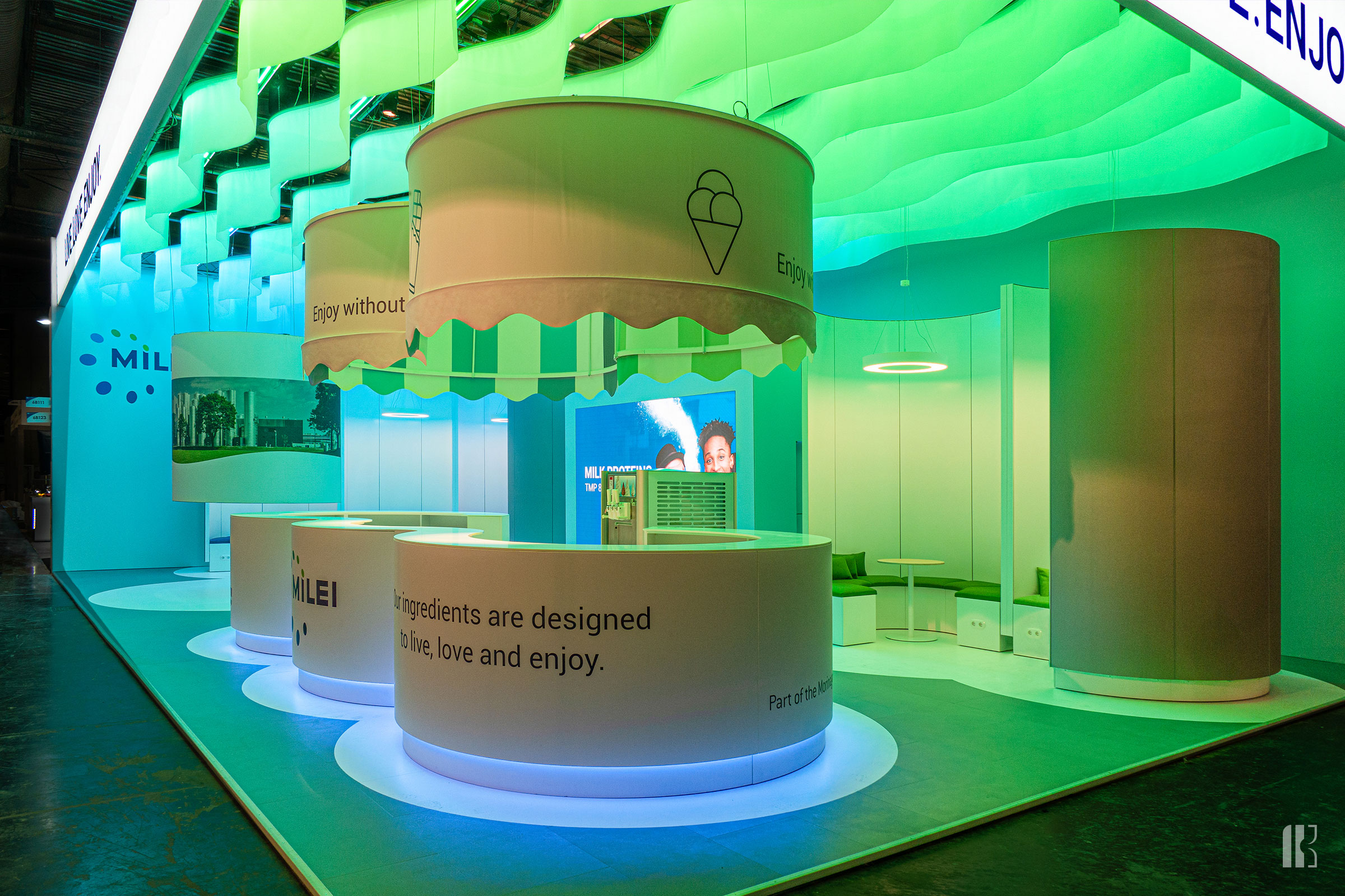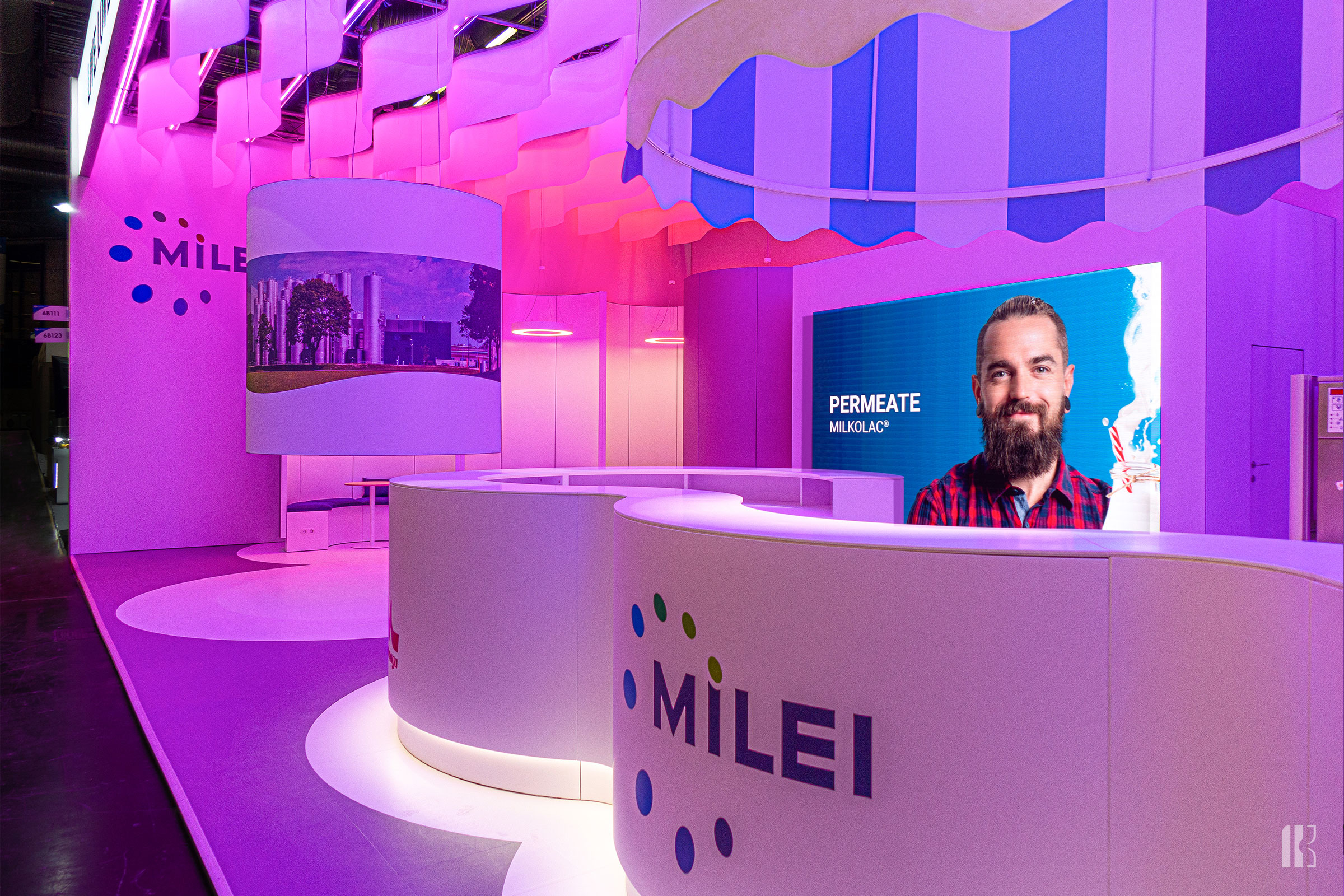 Die Milei GmbH entwickelt innovative Produkte im Bereich Milch und Molkederivate. Für die Messe FIE Paris 2019 wurde ein neuer Messestand geschaffen, der durch fließende organische milchweiße Formen, Wellen und visuelle Elemente die Marke von Milei erlebbar macht. Für die runden Sitznischen waren die Edelstahlgefäße für die Milchlagerung die Vorlage. In ein buntes Lichtspiel wird der Messestand durch die Unternehmensfarben getaucht. Nachhaltigkeit stand über allem, alle Möbel und der Boden sind modular aufgebaut und über Jahre flexibel einsetzbar. Entwicklung und Design im Modell M.1:50. Messestand Realisierung durch e.Konzept, Wangen.