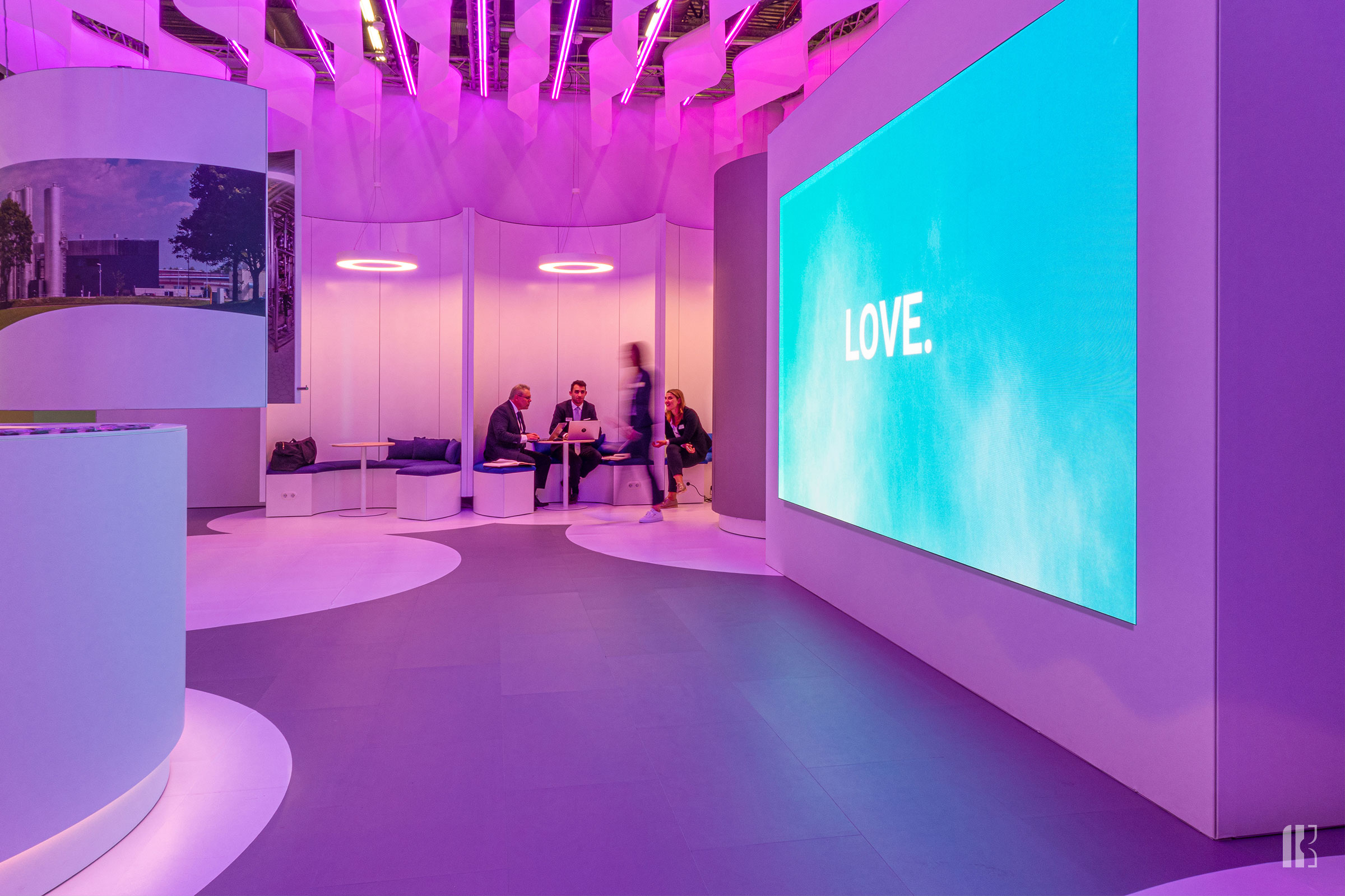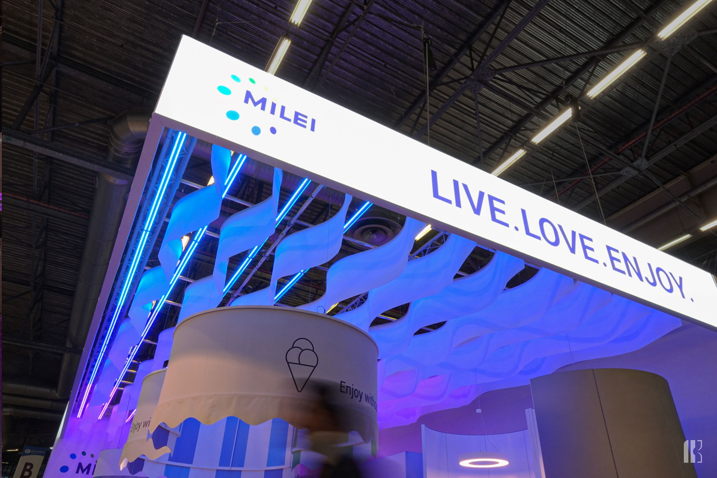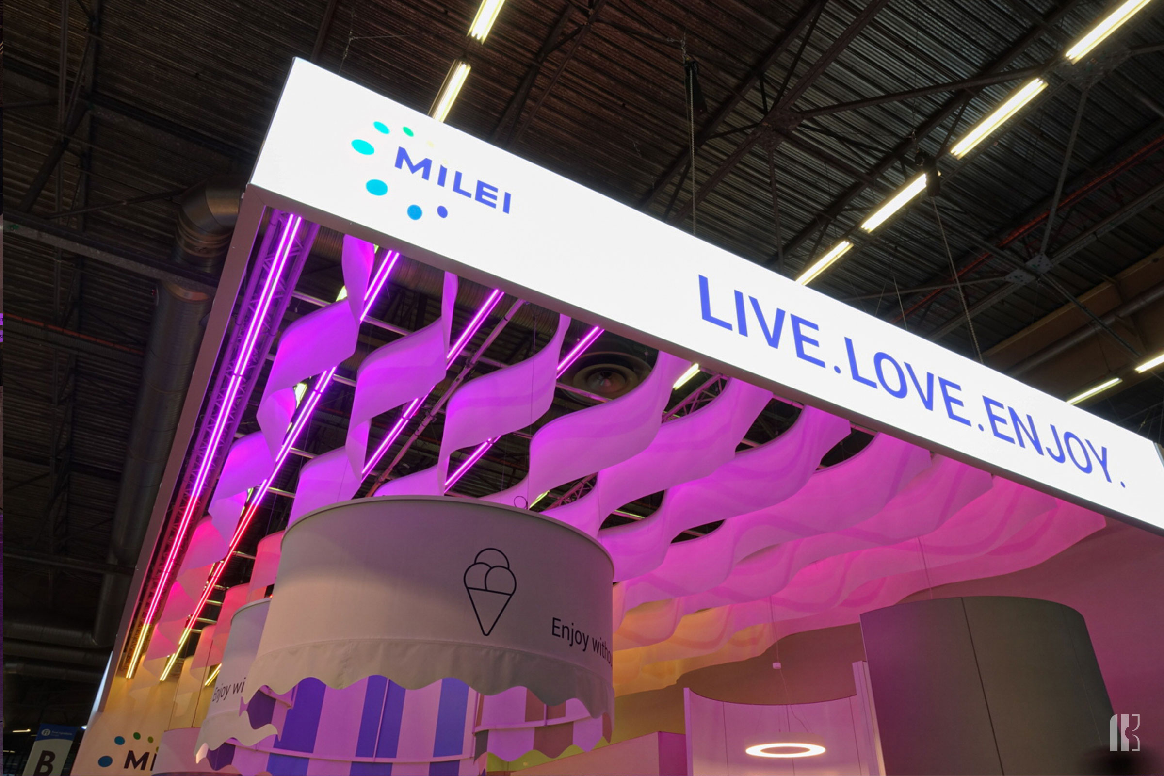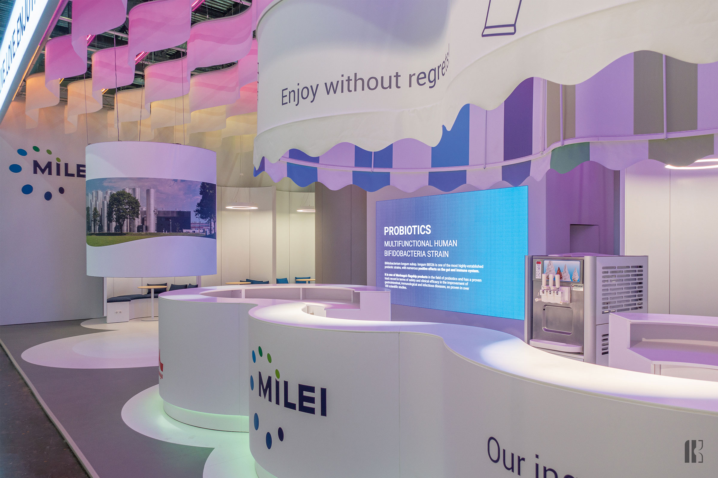 Die Milei GmbH entwickelt innovative Produkte im Bereich Milch und Molkederivate. Für die Messe FIE Paris 2019 wurde ein neuer Messestand geschaffen, der durch fließende organische milchweiße Formen, Wellen und visuelle Elemente die Marke von Milei erlebbar macht. Für die runden Sitznischen waren die Edelstahlgefäße für die Milchlagerung die Vorlage. In ein buntes Lichtspiel wird der Messestand durch die Unternehmensfarben getaucht. Nachhaltigkeit stand über allem, alle Möbel und der Boden sind modular aufgebaut und über Jahre flexibel einsetzbar. Entwicklung und Design im Modell M.1:50. Messestand Realisierung durch e.Konzept, Wangen.