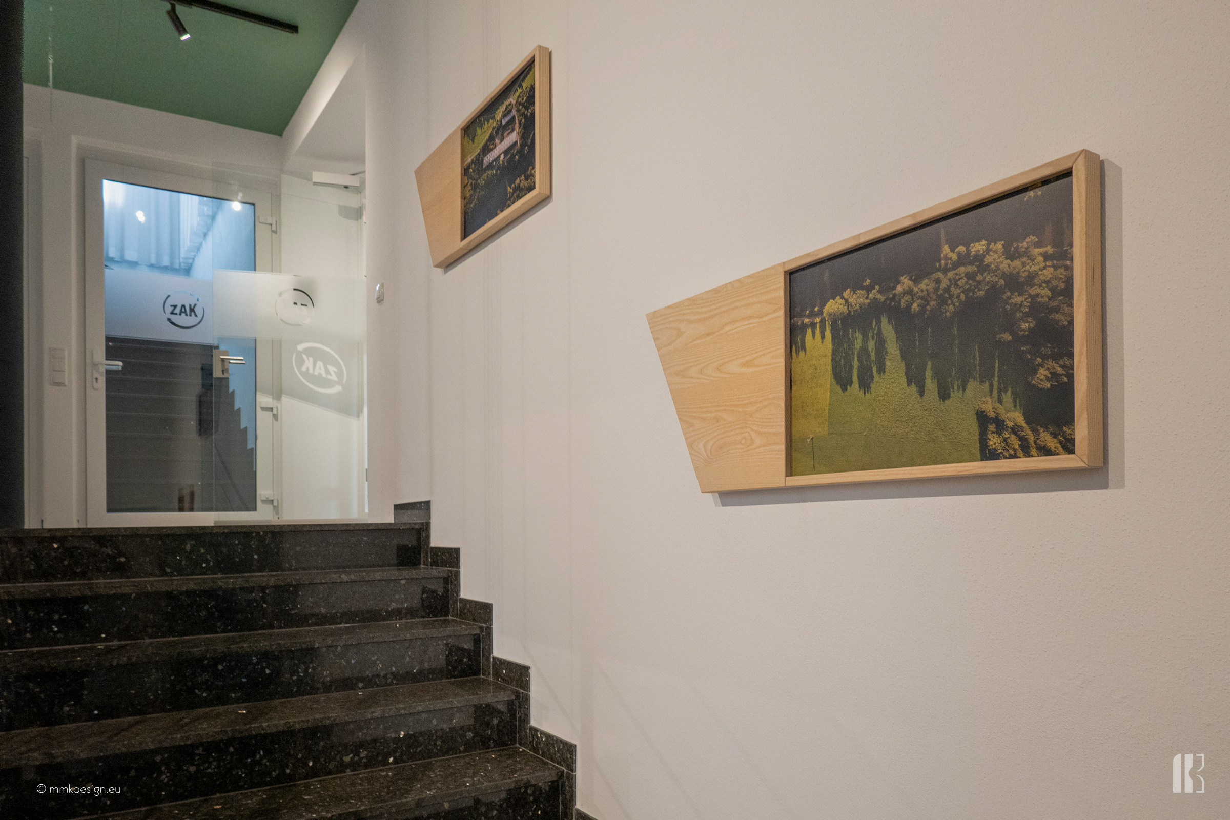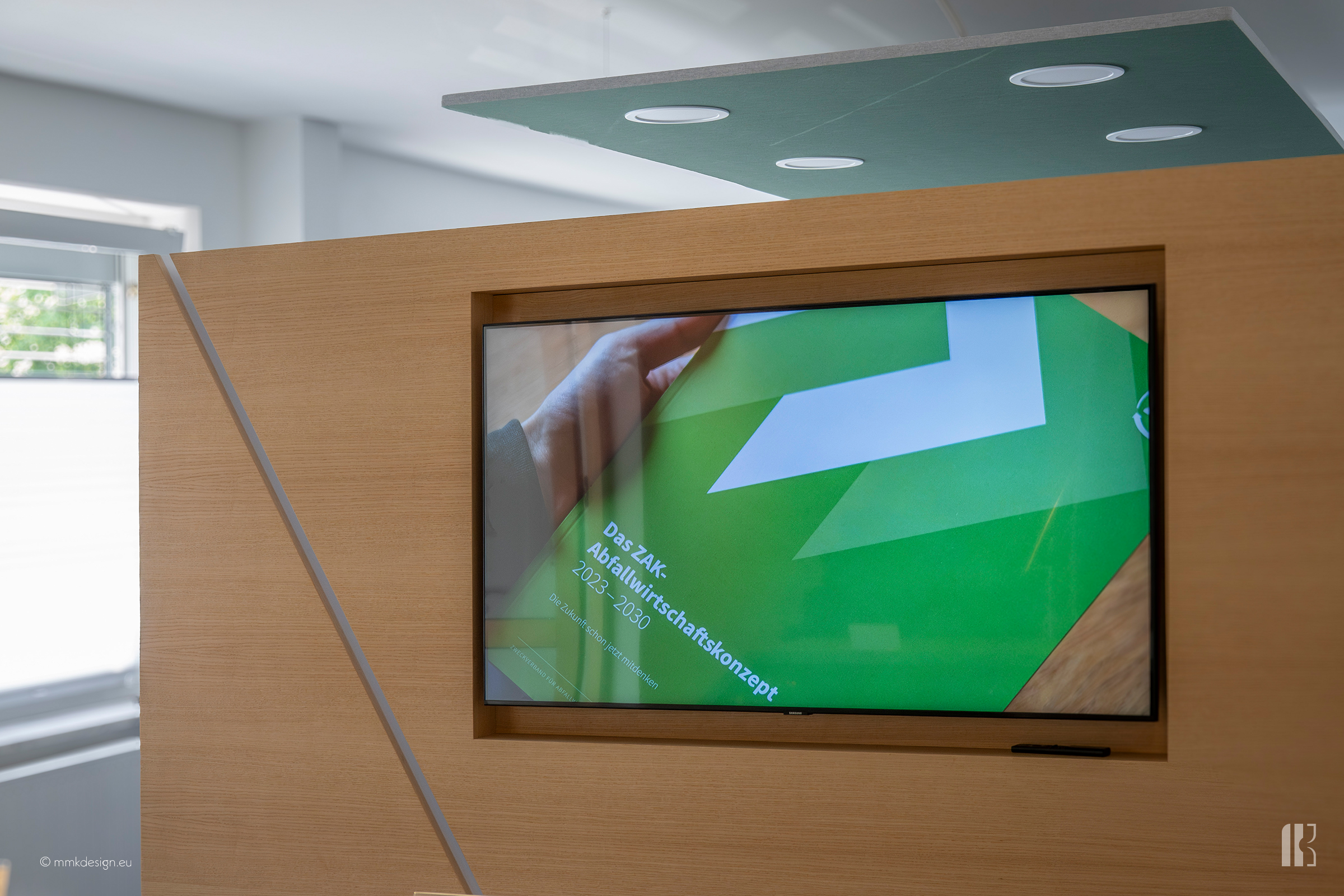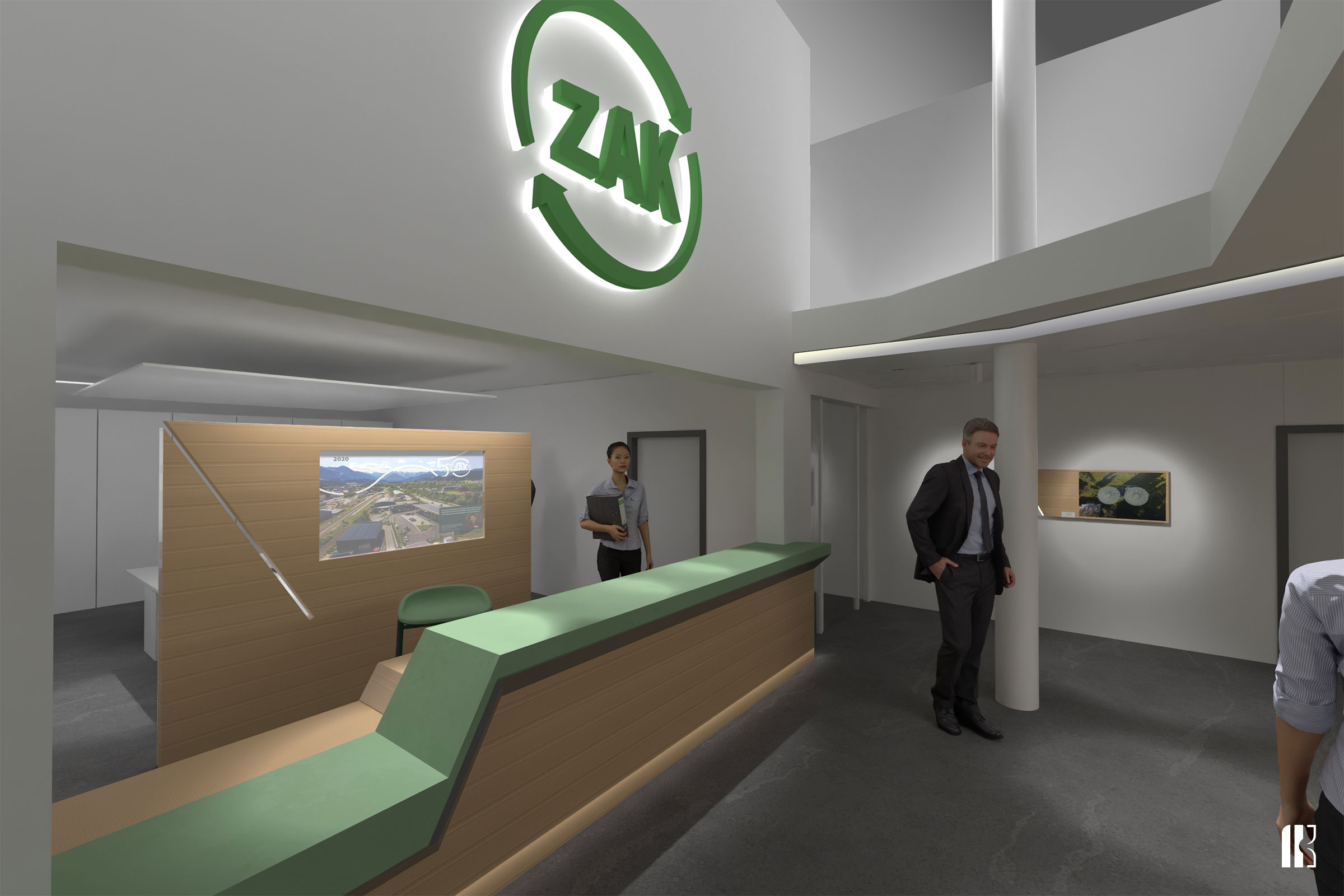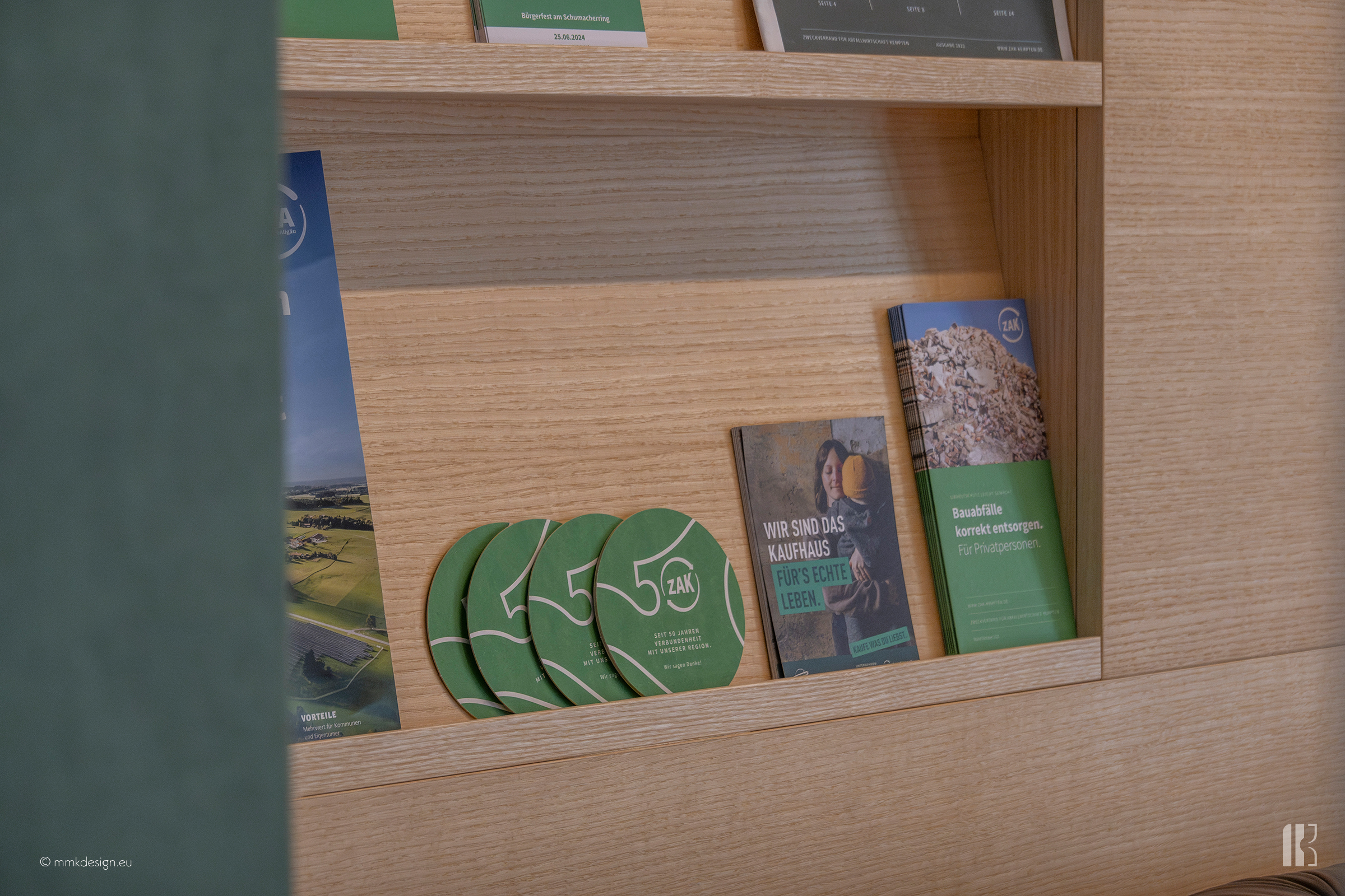 In der ZAK-Zentrale in Kempten wurde der Eingangsbereich und die Gänge mit angegliedertem Schulungsbereich 2023 innenarchitektonisch neugestaltet. Die ZAK Corporate Identity ist dabei in ein Material- und Raumkonzept übertragen worden, es entstand eine eigene Formensprache und ein Materialkonzept mit einem hohen Anteil an recycelten Stoffen mit akustischer Wirksamkeit.